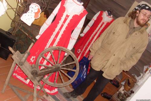 Экспонаты из собрания Ропшинского Краеведческого музея (зал традиционной культуры финно-угорских народов) и местный житель - посетитель музея.
